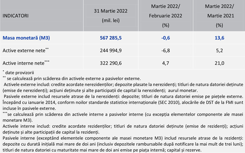 Masa monetară în sens larg (M3) a înregistrat la sfârșitul lunii martie 2022 un sold de 567 285,5 milioane lei. Aceasta a scăzut cu 0,6 la sută (-2,4 în termeni reali (1)) față de luna februarie 2022, iar în raport cu martie 2021 s-a majorat cu 13,6 la sută (3,2 la sută în termeni reali).