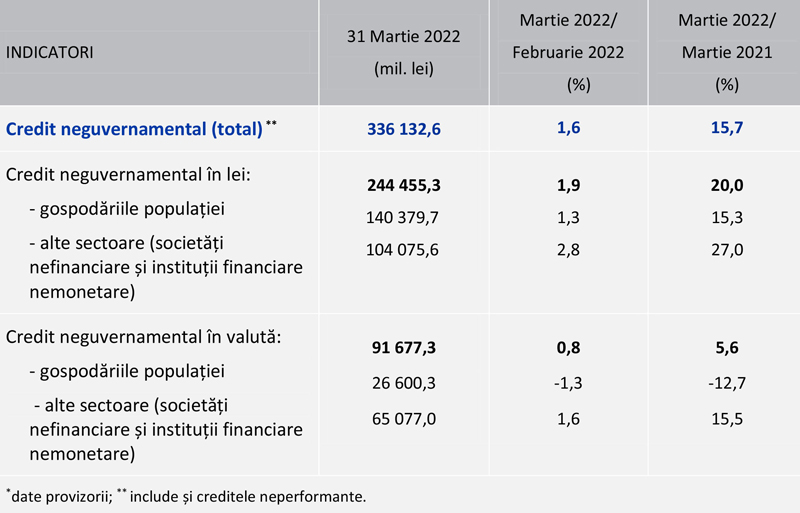 Soldul creditului neguvernamental acordat de instituțiile de credit a crescut în luna martie 2022 cu 1,6 la sută față de februarie 2022 (-0,3 la sută în termeni reali), până la nivelul de 336 132,6 milioane lei. Creditul în lei, cu o pondere de 72,7 la sută în volumul total al creditului neguvernamental, s-a majorat cu 1,9 la sută, iar creditul în valută exprimat în lei, cu o pondere de 27,3 la sută în totalul creditului neguvernamental, a crescut cu 0,8 la sută (evoluție similară în cazul exprimării indicatorului în euro).