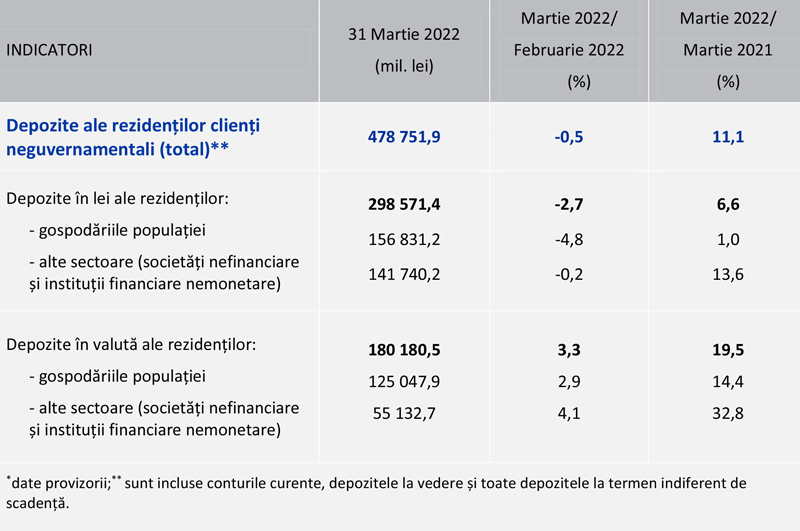 Depozitele în lei ale altor sectoare (societăți nefinanciare și instituții financiare nemonetare) au scăzut cu 0,2 la sută (până la 141 740,2 milioane lei) față de luna precedentă, iar față de luna martie 2021 au înregistrat o creștere de 13,6 la sută (3,1 la sută în termeni reali). Depozitele în valută ale rezidenților, exprimate în lei, reprezentând 37,6 la sută în volumul total al depozitelor clienților neguvernamentali, s-au majorat cu 3,3 la sută față de luna februarie 2022, ajungând până la nivelul de 180 180,5 milioane lei (exprimate în euro, acestea au crescut cu 3,3 la sută, până la 36 425,1 milioane euro). Comparativ cu luna martie 2021, indicatorul exprimat în lei a crescut cu 19,5 la sută (19,0 la sută, în cazul exprimării indicatorului în euro). Depozitele în valută ale gospodăriilor populației, exprimate în lei, au crescut cu 2,9 la sută față de luna februarie 2022, până la 125 047,9 milioane lei (evoluție similară în cazul exprimării indicatorului în euro). Comparativ cu aceeași perioadă a anului 2021, creșterea acestui indicator exprimat în lei a fost de 14,4 la sută (13,9 la sută, în cazul exprimării indicatorului în euro). Depozitele în valută ale altor sectoare, exprimate în lei, au crescut cu 4,1 la sută față de luna februarie 2022, până la 55 132,7 milioane lei (evoluție similară în cazul exprimării indicatorului în euro). Comparativ cu martie 2021, indicatorul exprimat în lei s-a majorat cu 32,8 la sută (32,2 la sută, în cazul exprimării indicatorului în euro).
