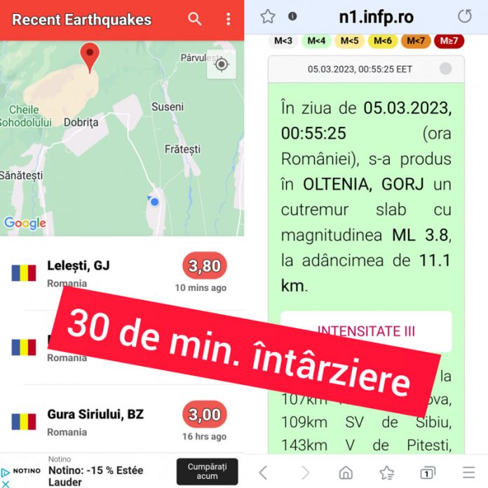 În noaptea de sâmbătă spre duminică au avut loc alte două cutremure în Gorj. Primul a fost mai puternic, unele aplicații anunțând că ar fi fost de 4,1 grade pe Richter, în timp ce INFP, cu o întârziere de o jumătate de oră, a publicat o magnitudine mai mică, de 3,8. Este prima întârziere majoră a Institutului, aceasta nefiind până acum justificată. De neînțeles de ce și revizuirea datelor producerii cutremurelor în Gorj arată, pe site INFP.ro, magnitudini mai mici. Pe rețelele sociale, târgujienii s-au revoltat față de întârzierea INFP, taxând Institutul de Fizică a Pământului.