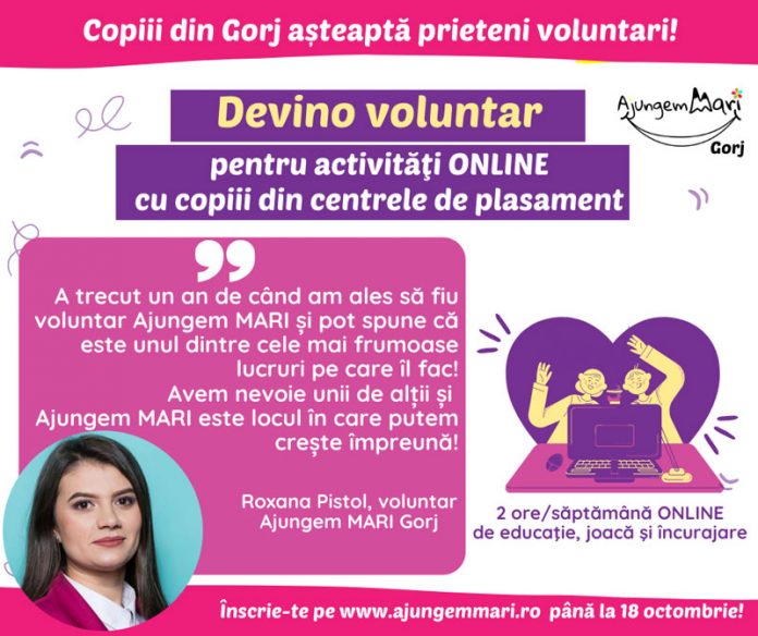 ,,Dacă vrei și tu să ajuți sau vrei să le dai de veste celor din jur, înscrierile pentru a deveni voluntar Ajungem MARI și pentru a ajuta copiii din centrele de plasament s-au prelungit până pe 18 octombrie”, au anunțat reprezentanții proiectului Ajungem MARI. În județul Gorj se caută voluntari pentru 62 de copii și tineri din centrul de zi și Complexul de Servicii Comunitare pentru Copilul cu Nevoi Speciale din Târgu-Jiu și casele de tip familial din Petrești și Răchiți. Cei mai mulți copii instituționalizați au mult de recuperat pe plan școlar și nu au încredere în forțele lor, că pot reuși în viață sau trece un examen dificil. Astfel, echipa Ajungem MARI caută oameni calzi, răbdători și consecvenți, care să le fie alături săptămânal și să îi ajute cu zâmbetul pe buze, prin metode interactive, să învețe și să prindă curaj.Pentru protejarea copiilor, anul acesta activitățile educative se vor desfășura online. Modulul de voluntariat durează 7 luni. Fiecare voluntar va lucra cu maximum trei copii, într-o ședință săptămânală de o oră și jumătate. Sunt așteptați voluntari din orice domeniu, motivați să îi sprijine pe copii. Voluntarii îi vor ajuta pe copii să scrie corect și să socotească, să recupereze informațiile pe care nu le-au înțeles la școală sau să se pregătească pentru examene (Evaluare Națională sau Bacalaureat). De asemenea, ei pot susține ateliere online de cultură generală sau dezvoltare personală și pot deveni mentori pentru tinerii care se pregătesc pentru o viață independentă. Voluntarii selectați vor participa la training-uri online despre lucrul cu copiii instituționalizați, iar consilierii educaționali îi vor sprijini pe parcurs să găsească metodele de predare atractive pentru copii.Termenul limită pentru înscriere s-a prelungit până la data de 18 octombrie. Înscrierea se face prin completarea unui formular online pe website-ul https://www.ajungemmari.ro/devino-voluntar/ unde se găsesc și toate detaliile despre voluntariat. Ajungem MARI este singurul program al Asociației Lindenfeld și susține educația a peste 2.500 de copii din centre de plasament și medii defavorizate din București și 24 de județe prin mai multe proiecte, cel mai important fiind cel de pregătire școlară într-un mod interactiv alături de peste 1.600 de voluntari. Alte proiecte includ cursuri vocaționale, ieșiri recreative și educative, excursii, tabere, logopedie, psihoterapie, educație financiară, civică și pentru sănătate, cursuri de calificare, consiliere vocațională și vizite de orientare profesională, toate cu rolul de a le da copiilor încredere în ei și a le forma abilități pentru a deveni adulți responsabili și independenți.
