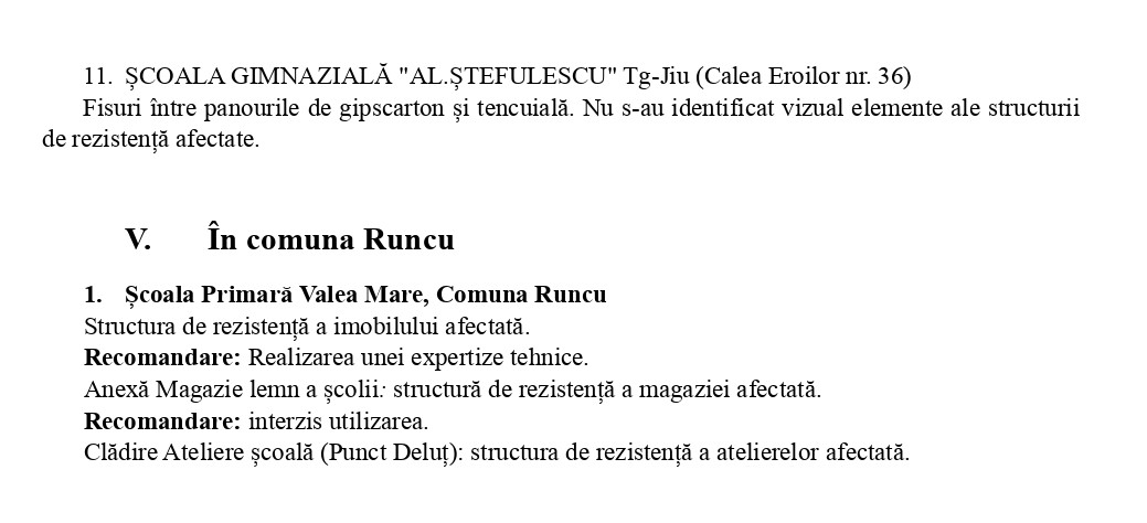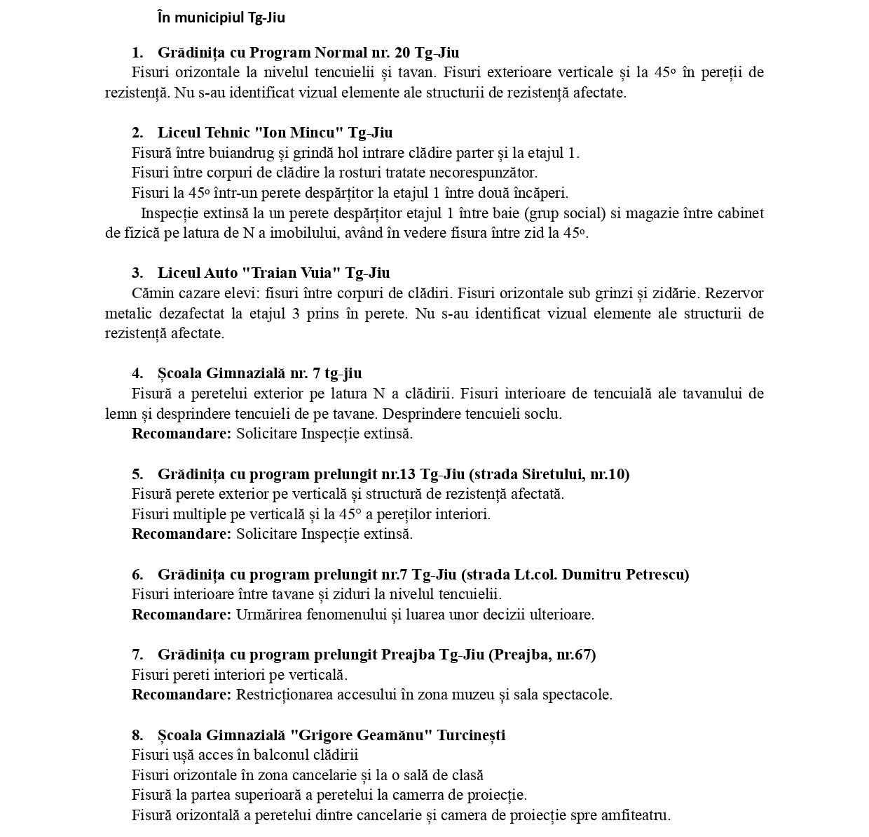 Comisiile mixte stabilite pentru evaluarea stării tehnice a imobilelor și a gradului de afectare a structurii de rezistență a clădirilor din Gorj recomandă extinderea inspecției pentru mai multe școli și grădinițe din județ, după ce au constatat că majoritatea prezintă fisuri la nivelul tencuielii și al tavanului.