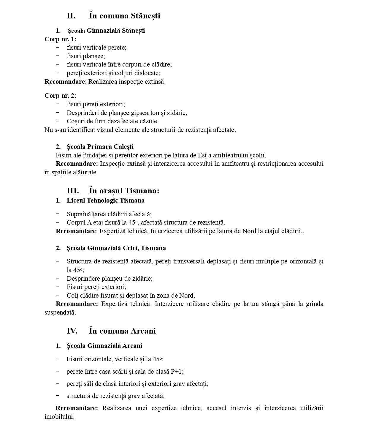 Probleme sunt și Stănești, Arcani și Runcu. „În comuna Arcani, la școala gimnazială sunt fisuri orizontale, verticale și la 45 de grade, pe perete între casa scării și sala de clasă P+1; pe pereți săli de clasă interiori și exteriori grav afectați; structură de rezistență grav afectată. Este necesară realizarea unei expertize tehnice, accesul interzis și interzicerea utilizării imobilului. În comuna Runcu, la Școala Primară Valea Mare, structura de rezistență a imobilului este afectată. În comuna Stănești, la Școala Gimnazială Stănești, se recomandă o inspecție extinsă, iar la Școala Primară Călești, unde sunt fisuri ale fundației și pereților exteriori pe latura de Est a amfiteatrului școlii, se recomandă o inspecție extinsă, interzicerea accesului în amfiteatru și restricționarea accesului în spațiile alăturate”, au raportat autoritățile.
