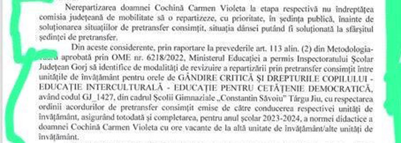 Subsemnatul, Negomireanu Dumitru Alin, profesor titular la Școala Gimnaziala Novaci, Șc. Gimnaziala Voievod Litovoi, Liceul Mihai Viteazul Bumbești Jiu, Liceul Tehnologic Constantin SandruBalta vă aduc la cunoștință următoarele: În data de 21 aprilie 2023 am participat la ședința de pretransfer stabilită de ISJ GORJ la disciplina educație socială(Gândire critică și drepturile copilului, Educație interculturală; Educație pentru cetățenie democratică, Educație financiară) și Filosofie. La începutul ședinței s-a prezentat numita Cochina Carmen Violeta care a ocupat 6 ore de educatie socială la Școala Gimnazială ”C. Savoiu” Târgu Jiu, Comisia de mobilitate motivând că are prioritate în exprimarea opțiunilor deoarece se află în situația de completare nesoluționată a normei didactice. Menționez că intenția mea a fost să optez pentru aceste ore, am susținut inspecția specială, m-am încadrat în condițiile specifice impuse de unitatea școlară și am obținut acord 2. Datorită acestui fapt am fost nevoit să optez pentru 9 ore de educație socială ( 5 ore la Bengești-Ciocadia și 4 ore la Liceul Teologic Târgu Jiu ). În aceeași zi, consultând siteul ISJ Gorj, rubrica ,,Resurse Umane” am constatat că numita Cochină Carmen Violeta nu și-a depus dosar pentru completarea normei didactice în etapa prevazută de Calendarul mobilității cadrelor didactice 2022-2023. Potrivit Metodologiei și Calendarului mobilității cadrelor didactice 2022-2023, cadrele didactice aflate în situația reducerii normei didactice, au obligația depunerii dosarului pentru soluționarea completării normei didactice în perioada 22-27 februarie 2023 și să participe la ședința organizată de ISJ Gorj. Doar în situația participării și nesoluționării completării normei didactice, cadrul didactic poate participa la următoarele etape prevazute în Calendarul Mobilității cadrelor didactice, nefiind și cazul numitei Cochină Carmen Violeta. Domnișoara Cochină nu a depus dosar în această etapă și în acest sens nu avea voie să participe la etapa de completare a normei didactice la nivelul județului Gorj. Solicit ISJ GORJ anularea deciziei de completare a domnișoarei Cochină Carmen Violeta și reluarea ședinței având în vedere faptul că Comisia de mobilitate nu a respectat Motodologia și Calendarul mobilității cadrelor didactice. Consider că am fost lezat în dreptul de a-mi exercita un drept legal, solicit un răspuns urgent și îmi rezerv dreptul de a face contestație și plângere penală deoarece apreciez tot ce s-a facut prin încălcarea normelor legale de către Comisia de Mobilitate a ISJ GORJ. Atașez lista cu candidații și puncatjele cadrelor didactice care au participat la etapa de completare a normei didactice la nivelul județului Gorj. ”. Din această listă lipsește profesoara Carmen Cochină, neavând dosar depus.