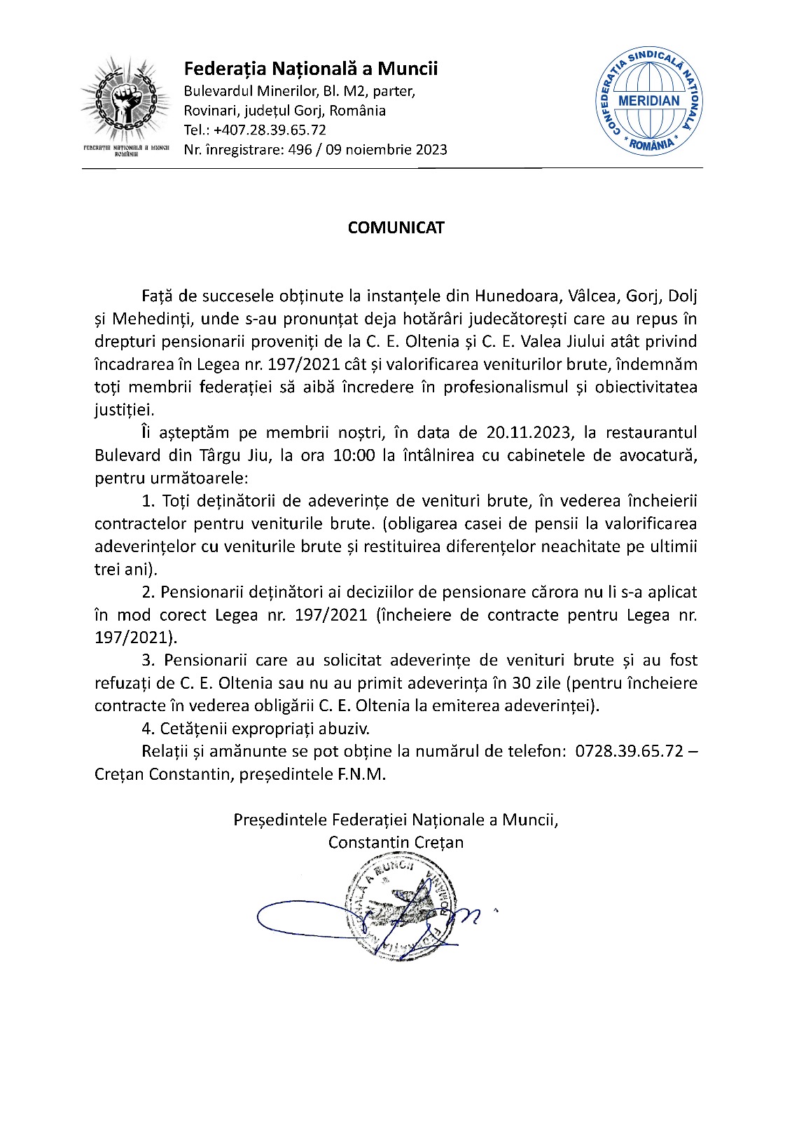 Federația Națională a Muncii anunță o nouă întâlnire a minerilor și energeticienilor din cinci județe cu casele de avocatură. Aceasta va avea loc în data de 20 noiembrie, la Restaurantul ”Bulevard”, din Târgu Jiu.