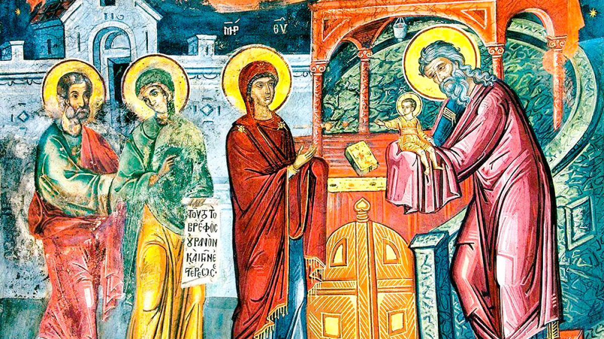 După 40 de zile de la naşterea Sa, Pruncul Sfânt a fost dus la Templul din Ierusalim, centrul vieţii religioase al naţiunii evreieşti. După legea lui Moise (Levitic 12, 2-8), femeia care a născut un prunc de parte bărbătească nu avea voie să intre în Templul Domnului timp de patruzeci de zile. La împlinirea acestei perioade, mama venea cu pruncul său la templu şi aducea jertfă un miel sau doi porumbei pentru sacrificiul purifcării, al curăţirii. Preasfânta Fecioară Maria nu avea nevoie de purificare deoarece a născut fără stricăciune pe Izvorul Curăţiei şi al Sfinţeniei. Cu toate acestea, ea s-a supus cu smerenie Legii timpului. În acea vreme, părintele sfânt şi dreptul Simeon (prăznuit pe 3 februarie în fiecare an) trăia în Ierusalim. Lui i s-a proorocit că nu va muri până ce nu va vedea pe Mesia cel promis. Luminat şi îndemnat de harul lui Dumnezeu, Simeon s-a dus la Templu chiar când Sfânta Fecioară şi Dreptul Iosif veneau cu pruncul Iisus să împlinească legea. O dată ce L-a văzut pe Mesia cel promis, Sfântul şi dreptul Simeon va aduce cântarea sa: ,,Acum, eliberează pe robul tău, Stăpâne, în pace; că văzură ochii mei mântuirea Ta pe care ai gătit-o întaintea feţei tuturor popoarelor: lumină spre descoperirea neamurilor şi slavă poporului Tău, Israel!“. Totodată, Sfântul şi dreptul Simeon, primitorul de Dumnezeu, i-a spus Sfintei Fecioare: ,,Acesta este pus spre căderea şi ridicarea multura din Israel şi ca un semn care va stârni împotriviri. Şi prin sufletul tău va trece sabie, ca să se descopere gândurile din multe inimi (Luca II, 34-35)“. Reflectând la aceste cuvinte prooroceşti spuse de Sfântul şi dreptul Simeon acum mai bine de două mii de ani, putem vedea cât adevăr se află în aceste cuvinte rostite sub inspiraţia Duhului Sfânt, chiar şi astăzi când credinţa în dumnezeiescul Mântuitor al neamului omenesc Iisus Hristos stârneşte atâtea împotriviri şi cuvinte pe care nu se cade nici unui om a le gândi, cu atât mai puţin a le rosti.