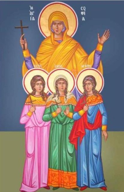 Am ales dintre sfinte, nu pentru a picta, deocamdată, ci, pentru a le cunoaşte mai bine, pentru viaţa lor zbuciumată şi mucenicească, pe Sfânta Muceniță Sofia, care a trăit în timpul împăratului Adrian (117-138) și care fiind căsătorită a născut trei fiice, cărora le-a pus numele după cele trei virtuți creștine: Pistis (Credința), pe a doua Elpis (Nădejdea), pe a treia Agapis (Dragostea). Dar, Sfânta Sofia rămânând văduvă după nașterea celor trei fete, le-a crescut pe acestea în credința creștină, iar, Domnitorul Antioh, auzind de înțelepciunea și frumusețea celor trei fete și convingându-se că sunt creștine, l-a înștiințat pe împăratul Adrian, care în scurt timp a trimis slujitorii pentru a le aduce pe cele trei fete la palat. Împreună cu ele a venit și mama lor, care le-a întărit în credință sfătuindu-le și învățându-le lucruri folositoare! Dar, Împăratul dorind să le facă să jertfească zeiței Artemida, cele trei fete au refuzat cu desăvârșire, mărturisind credința în Domnul nostru Iisus Hristos, singurul și adevăratul Dumnezeu, însă, atunci ele au fost supuse supliciilor, suferind moarte martirică și îmbrățișând cununa muceniciei. Mama lor le-a luat trupurile și le-a îngropat, ea însăși trecând la Domnul în timp ce se afla la mormintele fetelor sale. Să spunem că din anul 1992, Sfânta Muceniță Sofia este ocrotitoarea capitalei Bulgariei, unde este scris: ,,Trupul trăiește, dacă e locuit de suflet; iar sufletul trăiește cu voia Lui Dumnezeu”! Deci, Sfânta Muceniţă Sofia şi fiicele sale, Pistis, Elpis şi Agapis au vieţuit în Italia şi au pătimit în timpul domniei împăratului Adrian (117-138), iar, ziua de 17 septembrie, care ne aminteşte de Sfânta Sofia împreună cu fiicele ei Pistis (Credinţa), Elpis (Nădejdea) şi Agapis (Dragostea) este un bun prilej pentru Biserica lui Hristos de a vedea cum izvorăşte harul în oameni prin sfinţenie, feciorie şi jertfă preacurată de sine. Căci aceste tinere fecioare, trei la număr, pline de înţelepciunea Treimii celei mai presus de fire, au înţeles taina veacului viitor şi a tuturor veacurilor, adică, iubirea cea infinită dăruită de Dumnezeu oamenilor care se unesc cu El în rugăciune, şi au preţuit această taină mai mult decât întregul univers, mai mult decât viaţa lor, şi au câştigat nemurirea. Aceste sfinte au fost făcătoare de minuni în viaţă, în moarte şi în veşnicie. Şi mama lor, purtătoare a numelui lui Dumnezeu, care le-a născut şi şi-a văzut fiinţa crescând în ele, care le-a privegheat în moarte şi în înviere, a murit de durere după trei zile, pe mormântul fiicelor ei, închipuind moartea şi învierea lui Hristos în inima lor şi în inima ei, pentru veşnicie. Aceste fiinţe sunt pentru mine cununa de virtuţi teologice şi nu numai, pentru că în drumul vieţii omul se poate întâlni cu acestea dacă doreşte să trăiască cu adevărat. A crede în ceva, în cineva, în tine constituie virtuţi care dau sens vieţii. A avea nădejde înseamnă că ceea ce crezi se v-a întâmpla. Nădejdea este de fapt o amprentă repetată a credinţei. Dragostea este cea mai puternică forţă a omului pentru că face parte din ceea ce înseamnă Dumnezeu, Cel care înseamnă dragoste. Omul creat de Dumnezeu a primit această parte a Divinului, a Sacrului, a lui Dumnezeu, pentru că Dumnezeu a dorit ca omul să fie fiinţa ce îl poartă pe El aici pe Pământ. Așa de înțelepțește și-a sfârșit Sofia alergarea sa întru credinţă, aducând Sfintei Treimi în dar pe cele trei îmbunătățite fiice ale sale, Pistis, Elpida și Agapi! O, sfânta și dreaptă Sofie! Care dintre femei s-a mântuit așa prin nașterea de fii, precum tu, care ai născut niște fiice ca acestea care Mântuitorului s-au făcut mirese și pentru dânsul pătimind, cu dânsul acum împărățesc și se proslăvesc! Cu adevărat tu ești mamă minunată și vrednică de bună pomenire, că privind la cele cumplite și amare chinuri și la morțile fiicelor tale celor iubite, nimic nu te-a durut de dânsele ca pe o maică, ci cu atât mai mult te-ai bucurat de darul lui Dumnezeu, mângâindu-te, și singură le-ai învățat pe ele și le-ai rugat să nu-și cruțe viața lor vremelnică, ci să-și verse fără de cruțare sângele pentru Hristos Domnul, de a cărui prea luminată față acum, prin vedere, te veselești la cer, cu sfintele tale fiice! Înțelepțește-ne și pe noi ca să aducem roadele virtuților credinței, nădejdei și dragostei și să ne învrednicim ca înaintea preasfintei, neziditei și de viață făcătoarei Treimi să stăm și să o slăvim pe ea în vecii vecilor, pentru că în fiecare om există Dumnezeu, dar, mai ales pentru că el, omul a primit Lumina lui Dumnezeu, adică Dragostea. Lumina cea mai mică alungă orice întuneric din sufletul omului! Credinţa cea mai mică aduce nădejdea, adică speranţa, aceea care înseamnă gând şi faptă, adică, realitatea adusă în faţa omului prezent. Prezentul este poarta viitorului. Prin urmare, să ne folosim darurile primite şi ne vom putea bucura de viitorul care se duce mereu înainte!
