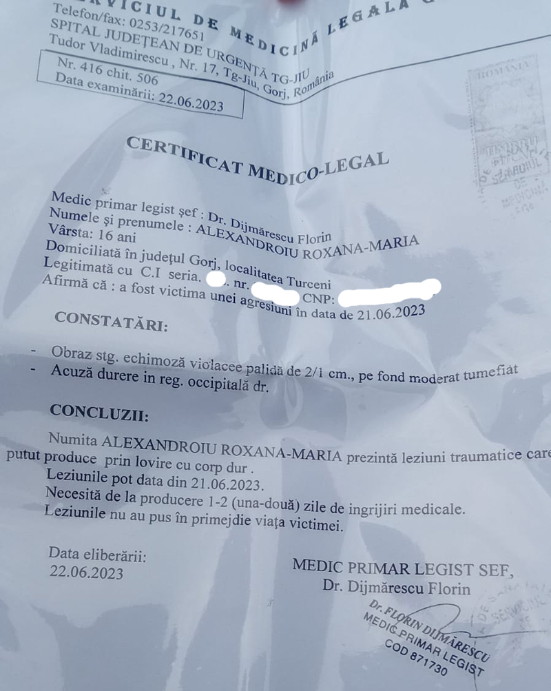 O învățătoare de la Turceni a lovit o fată de 16 ani, ieri după-amiază. Mama copilului bătut a depus plângere la poliție, iar azi-dimineață a mers la cabinetul de medicină legală, fetița primind un certificat: ,,Obraz stâng echimoză violacee, pe fond moderat tumefiată. Acuză dureri în regiunea occipitală. îngrijiri medicale, 1,2 zile. Prezintă leziuni care s-ar fi putut produce cu corp dur”.