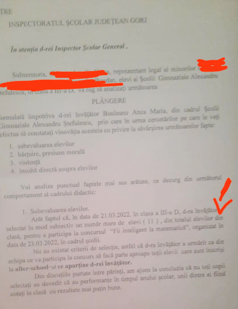 Școlar Județean Gorj dar și unității de învățământ, sesizând că învățătoarea copiilor ar săvârși cu intenție subevaluarea elevilor în cauză, hărțuire și presiune morală la adresa