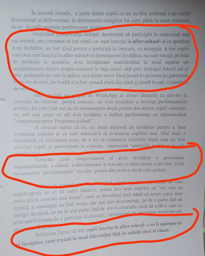 fost selectați s-au simțit defavorizați și discriminați, în detrimentul colegilor lor care, până la acel moment, nu au dovedit anumite performanțe școlare”, se arată în sesizarea ajunsă pe masa inspectorului școlar general, în care se subliniază clar că toți elevii selectați frecventau after school-ul învățătoarei în cauză.