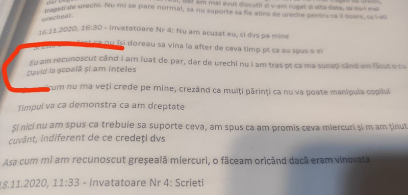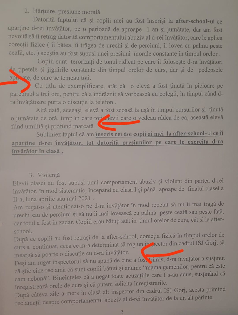 domnișoarei învățător care le aplica corecții fizice(îi bătea, îi trăgea de urechi sau de perciuni, îi lovea cu palma peste ceafă etc..)”. Se subliniază că acești copii ar fi fost supuși unei presiuni morale constante în timp orelor, după ce părinții au ales să nu mai plătească