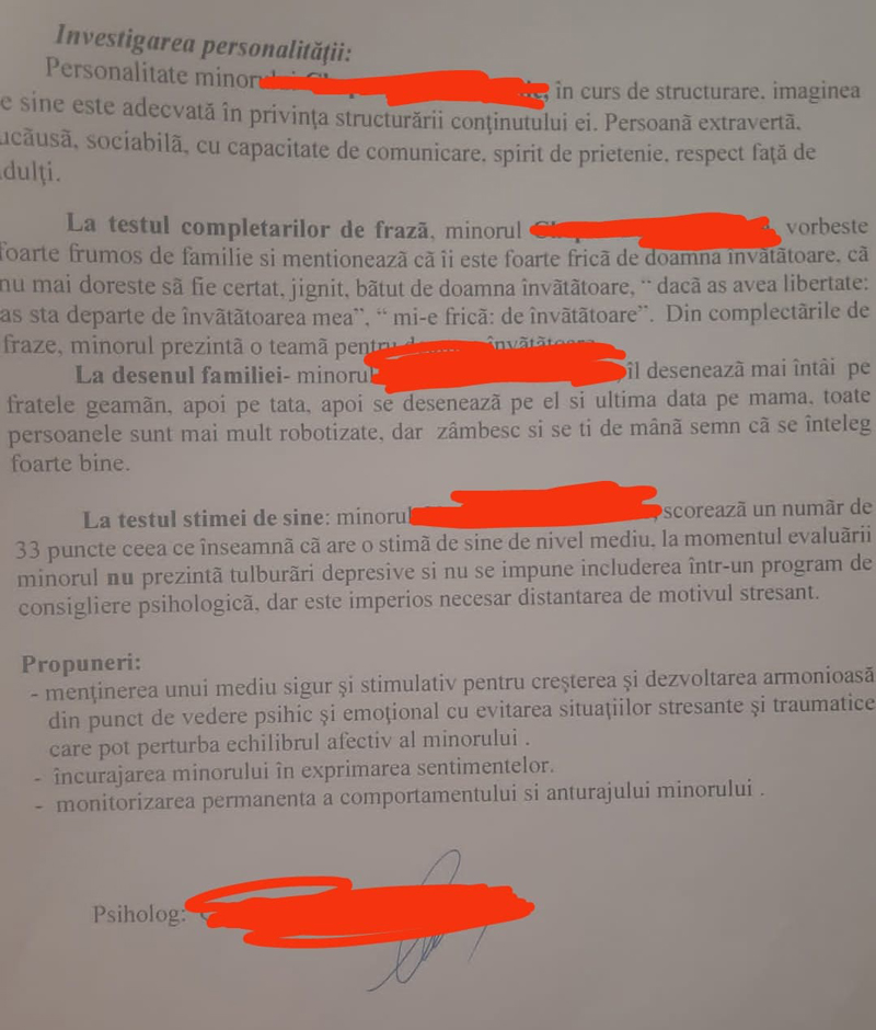 unei stări de teamă în rândul elevilor. Raportul de evaluare psihologică a elevilor denotă acest lucru și a fost transmis, ca atare, Parchetului de pe lângă Judecătoria Târgu-Jiu.