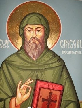 asupra Sfintei Cruci, cu care era înarmat, ei singuri au plecat din peşteră, însă, nu după multe zile, iarăşi s-au prefăcut în chip de ostaşi mulţi şi au venit în peşteră cu săbii, cu suliţe, cu arcuri şi cu unelte de război. După ce s-a curăţit de patimile trupului şi ale sufletului, după ce a primit darul Sfântului Duh întru sine şi a strălucit cu lumină cerească şi dumnezeiască, s-a făcut vas ales, ca să ducă mărturisirea dreptei şi sfintei credinţe înaintea neamurilor celor abătute la minte cu eresul luptei contra sfintelor icoane. După ce s-a făcut bunămireasmă a lui Hristos, ca să dea celor credincioşi bunămireasmă de faptă bună, atunci Dumnezeu, care ştie inima fiecăruia, judecând că nu este cuviincios a se ascunde această prealuminată făclie sub obrocul pustiei, l-a chemat, zicând către dânsul: ,,Grigorie, dacă vrei să ajungi la desăvârşire, ieşi din pământul tău şi din rudenia ta şi înstrăinează-te pentru folosul tău şi al celor ce au trebuinţă de învăţătura ta”! Sfântul Cuv. Grigorie s-a dus la Tesalonic şi, după ce a intrat în cetate, a mers la o mănăstire în care era un pustnic vestit şi un egumen care se numea Marcu! Într-o zi, a venit la dânsul o femeie îndrăcită şi cu rugăciunea lui a gonit dracul şi încă multe alte minuni a săvârşit în locul acela. Sfintele sale moaşte au rămas multă vreme în acea mănăstire în care s-a săvârşit şi dădeau tămăduiri neîncetat, pentru toate felurile de boli, tuturor celor ce alergau cu credinţă neîndoită către dânsele. Atunci, prea binecredinciosul ban Barbu Craioveanul, care se trăgea din neamul Basarabilor, acei care au umplut Ţara Românească de sfinte mănăstiri, zidind din temelie Sfânta Mănăstire Bistriţa, întru cinstirea Adormirii Prea Sfintei Născătoare de Dumnezeu şi pururea Fecioara Maria, pe apa Bistriţei, vrând să o împodobească cu un odor scump şi sfânt ca acesta, cu multă sârguinţă şi cu multă rugăciune către Dumnezeu şi către sfântul, le-a adus cu mare cheltuială din mănăstirea în care se aflau, în sfânta mănăstire cea nou zidită şi le-a aşezat aici, cu multă cinste şi evlavie! De atunci şi până în ziua de astăzi, se află acolo nestrămutate, întregi şi nestricate, izvorând mireasmă preafrumoasă şi dând tămăduiri pentru tot felul de boli, tuturor celor ce aleargă cu credinţă la ele, deoarece, darul şi sfinţenia aleşilor lui Dumnezeu este neîmpuţinat, iar, ţara noastră o păzeşte şi o ocroteşte de multe feluri de necazuri şi de primejdii!