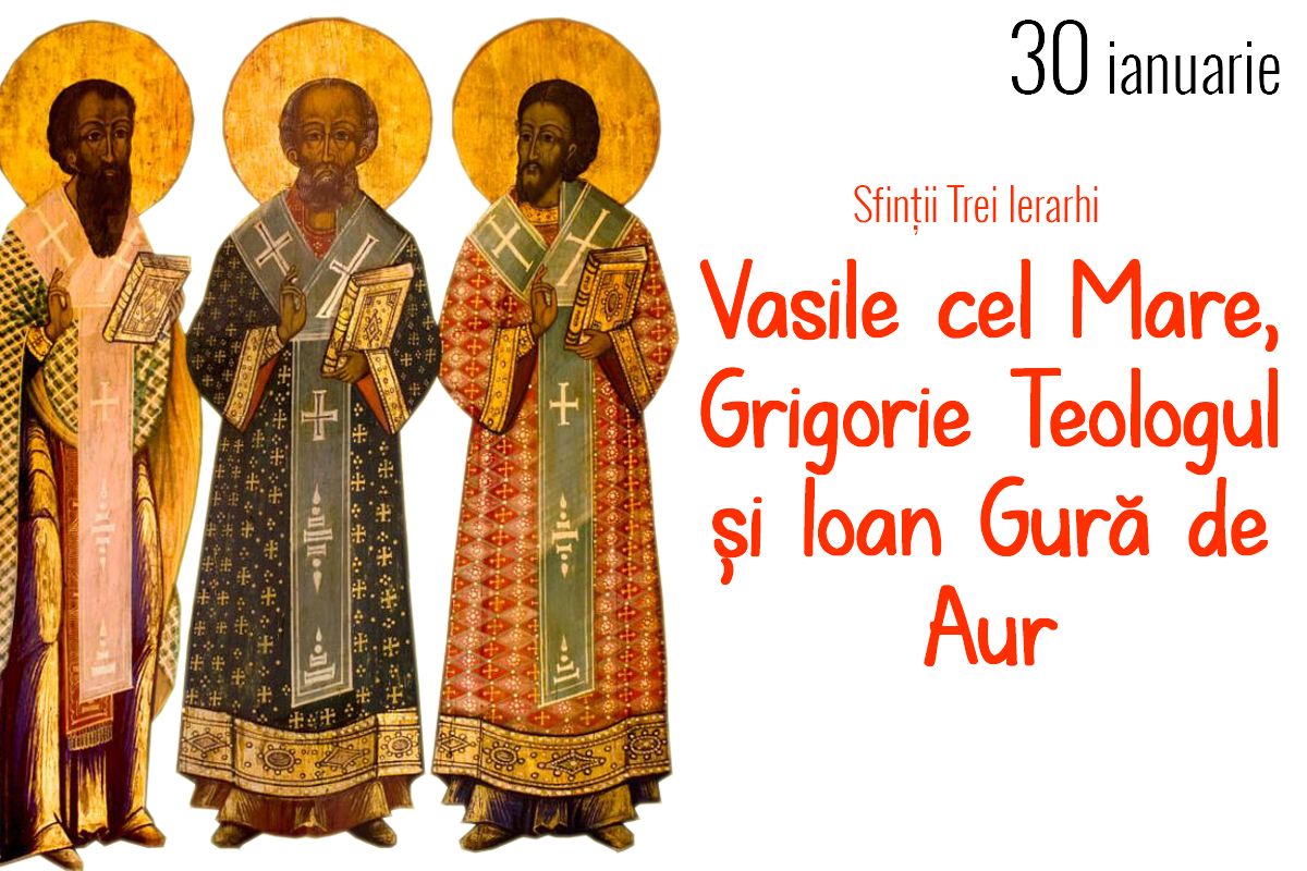 În ziua de marţi, 30 ianuarie 2024, Biserica Ortodoxă Română i-a prăznuit pe Sfinţii Trei Ierarhi Vasile cel Mare, Grigorie Teologul şi Ioan Gură de Aur, marii «Protectori ai învăţământului teologic”, fiecare dintre ei având o contribuţie importantă la evoluţia teologiei creştine. Toţi trei au dus o luptă aprigă şi fără încetare pentru păzirea dreptei credinţe şi au avut un rol important în formularea dogmei «Sfintei Treimi», iar, pe lângă darul tâlcuirii Sfintelor Scripturi, au deţinut şi înalta treaptă a arhieriei. Deci, Sărbătoarea Sfinţilor Trei Ierarhi are, în esenţă, o simbolistică a comuniunii: astfel cum în Sfânta Treime deosebirea dintre Tatăl, Fiul şi Sfântul Duh, nu duce la dezbinare şi nici unitatea lor la depersonalizare, tot la fel, nici noi, ca persoane diferite, nu suntem chemaţi să trăim separat unii de alţii sau să ne ridicăm unii împotriva altora, ci să trăim după modelul Sfintei Treimi – în comuniune unii cu ceilalţi! Chiar dacă Biserica îi pomeneşte pe cei trei ierarhi, atât separat – pe Sfântul Vasile la 1 ianuarie, pe Sfântul Grigorie la 25 ianuarie şi pe Sfântul Ioan Gură de Aur la 27 ianuarie – arătând şi deosebirile dintre aceştia, dar şi împreună îi sărbătoreşte pe 30 ianuarie, pentru a arăta unitatea de învăţătură şi pentru a le arăta creştinilor că nu este unul mai mare decât altul! Cei trei Sfinţi Părinţi au fost luminători ai creştinătăţii, mari dascăli ai lumii, care au lăsat importante scrieri şi au îmbogăţit sfintele slujbe. Sfântul Vasile cel Mare şi Sfântul Ioan Gură de Aur au alcătuit Liturghiile ritului bizantin (acestora alăturându-se Liturghia Darurilor mai