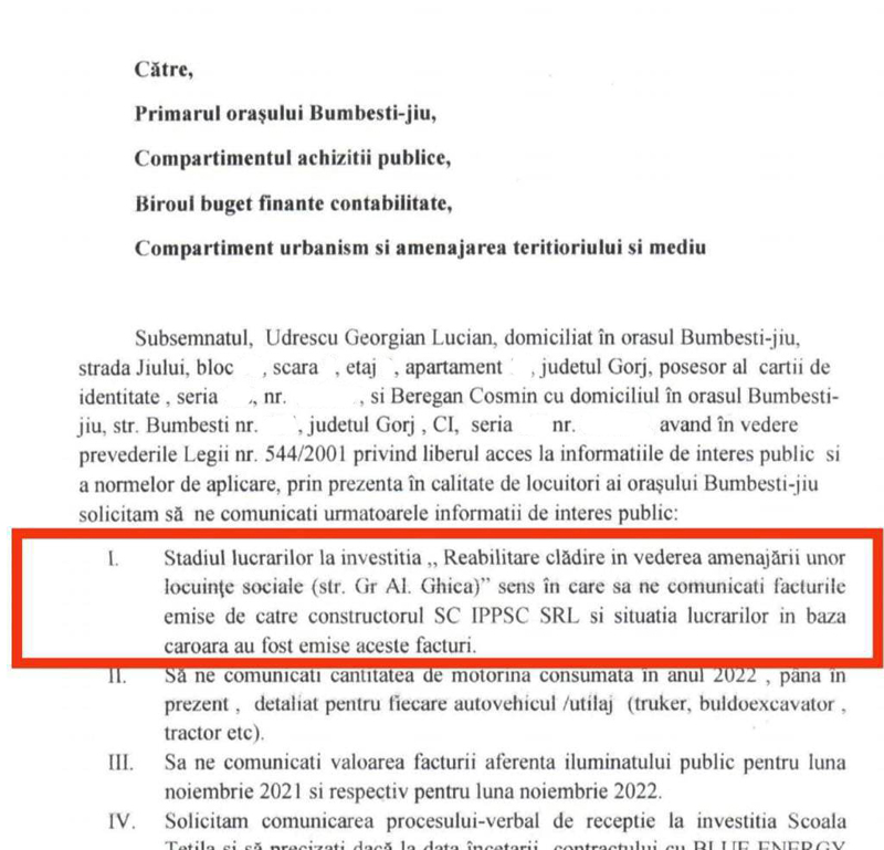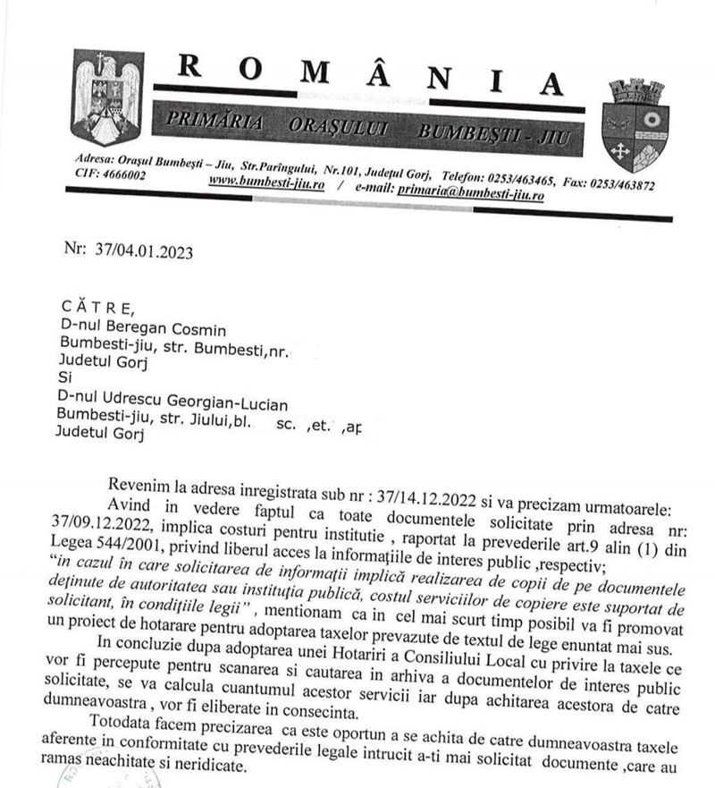 Cetățenii au făcut cerere pe Legea 544 la Primăria Bumbești Jiu, încă din decembrie, pentru