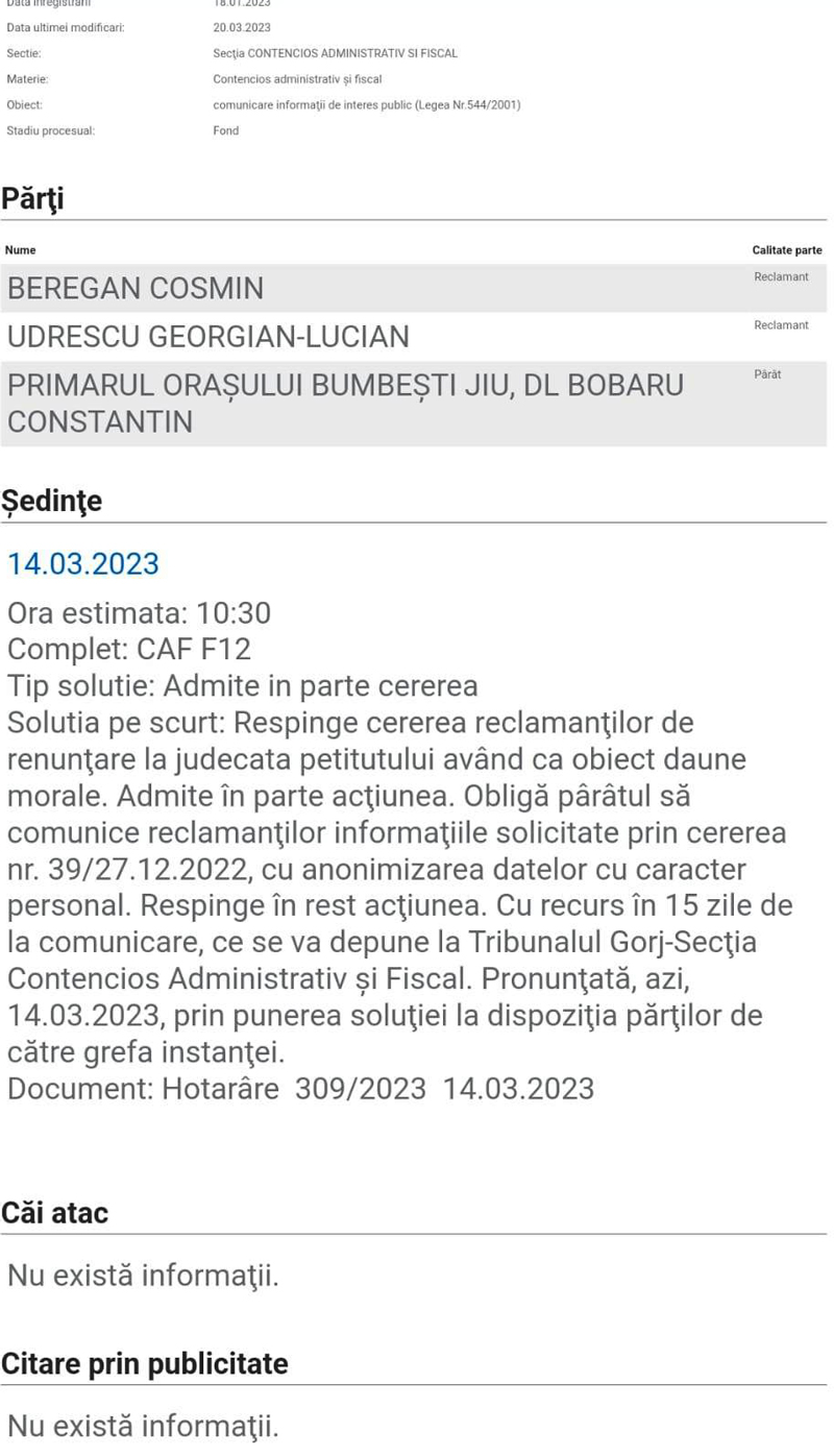 Solicitarea a fost refuzată de primărie, iar din acest motiv s-a ajuns la instanța de judecată care a obligat primăria, potrivit sentinței de fond, să fie transparentă.