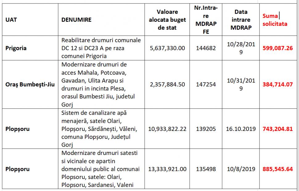 Nici Primăria Bumbești-Jiu nu a primit banii ceruți, circa 400 mii de lei, pentru modernizarea unor drumuri de acces. Alte două facturi, de peste 1,5 milioane de lei, care vizează lucrările la sistemul de canalizare apă menajeră și de modernizare a drumurilor sătești și vicinale din comuna Plopșoru, au fost respinse la plată.