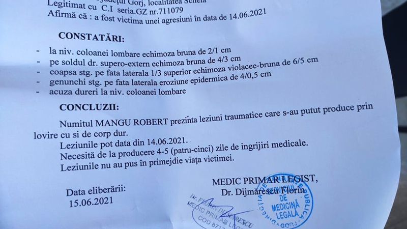,,Am fost lovit, din spate. Prima dată am primit un pumn în cap, care m-a făcut să cad la pământ. Apoi, muncitorul a început să mă lovească cu picioarele. Erau mai mulți angajați ai primăriei în curte, dar nimeni nu a intervenit, pe motiv că i-am reclamat și pe ei. Primarul a fugit și el prin școală, ca să nu intervină. Mă gândesc că el l-a pus pe subaltern să mă bată, că mă aștept la orice, pentru că vor să mă reducă la tăcere. Reclamațiile mele s-au dovedit reale și evident că deranjez. Am depus plângere la IPJ și am solicitat certificat medico-legal”, a spus Robert Mangu. Acesta susține că agresorul i-a luat telefonul mobil, pe motiv că prin intermediul acestuia face reclamații, sunând la poliție, la presă sau la alte autorități.