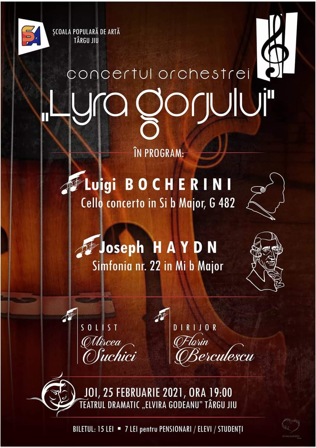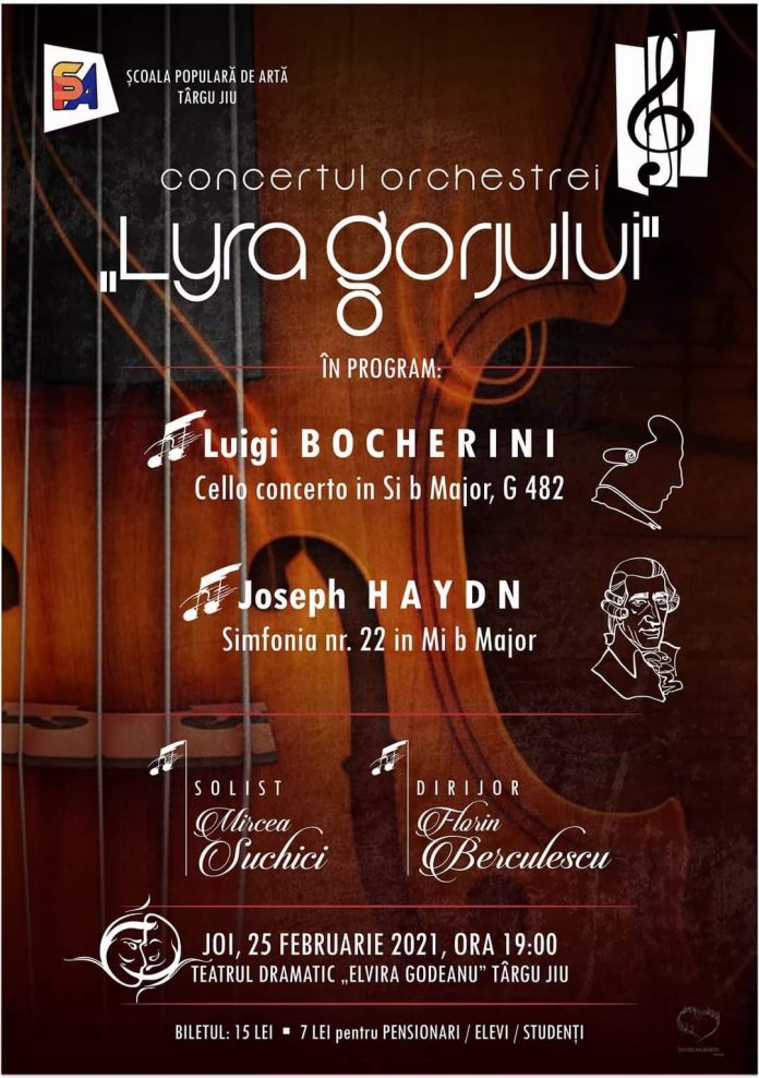 Târgujienii sunt așteptați la un nou concert al Orchestrei de Cameră ”Lyra Gorjului”, ce va avea loc joi, 25 februarie 2021, cu începere de la ora 19:00, la Teatrul Dramatic ”Elvira Godeanu” din Târgu Jiu. Evenimentul este organizat de Școala Populară de Arte ”Constantin Brâncuși” Târgu Jiu, cu sprijinul Consiliul Județean Gorj și al Teatrului Dramatic ”Elvira Godeanu” din Târgu Jiu. Prețul unui bilet este de 15 lei, iar pentru elevi, studenți și pensionari este de 7 lei. Biletele pot fi achiziționate de la casieria din foaierul teatrului, înainte de intrarea la spectacol.
