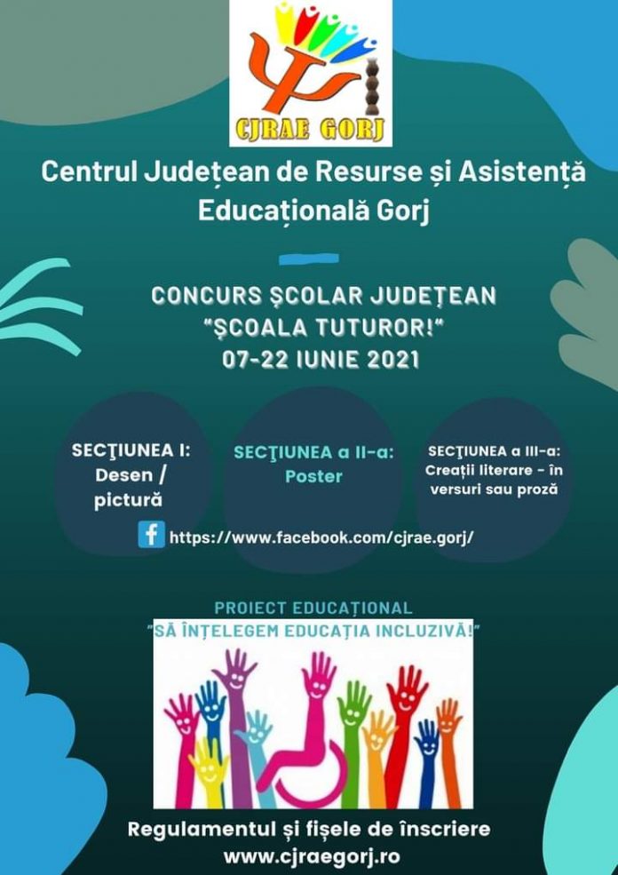 Elevii din ciclurile primar, gimnazial și liceal din județul Gorj sunt invitați să participe la Concursul Școlar Județean „Școala tuturor”, organizat de Centrul Județean de Resurse și Asistență Educațională Gorj.
