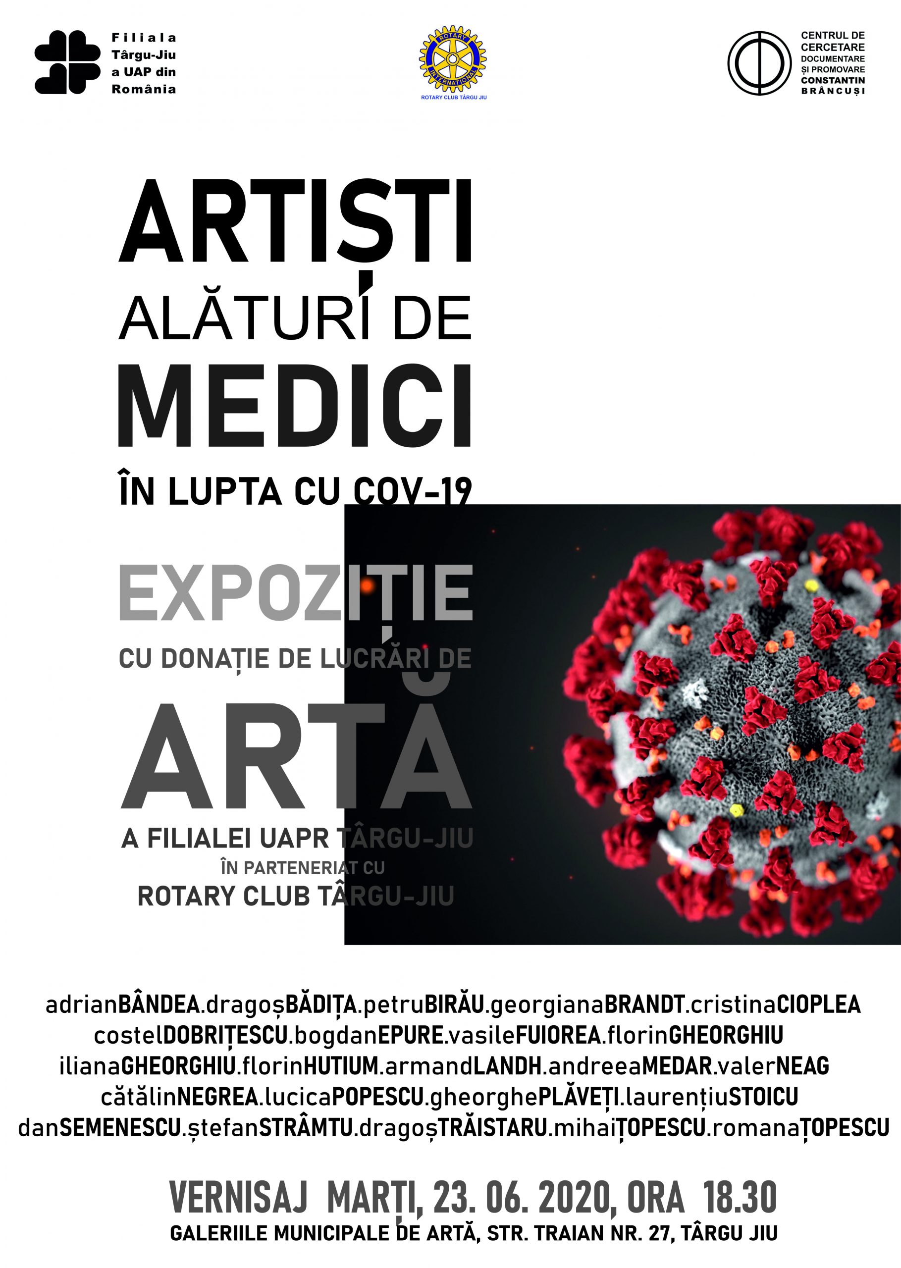 Filiala Târgu Jiu a Uniunii Artiștilor Plastici din România, în parteneriat cu Rotary Club Târgu Jiu și Centrul de Cercetare, Documentare și Promovare „Constantin Brâncuși”, organizează marți, 23 iunie 2020, ora 18:30, la Galeriile Municipale de Artă din Târgu Jiu, Strada Traian nr.27, parter, vernisajul expoziției de arte vizuale cu donație: „ARTIȘTI ALĂTURI DE MEDICI ÎN LUPTA CU COV-19”. Expoziția este deschisă publicului doar în această zi (23 iunie pe perioada vernisajului, cu începere de la ora 18:30), cu respectarea normelor în vigoare privind distanțare socială și purtarea măștii în interior, precum și accesul unui număr redus de persoane în spațiul de expunere.