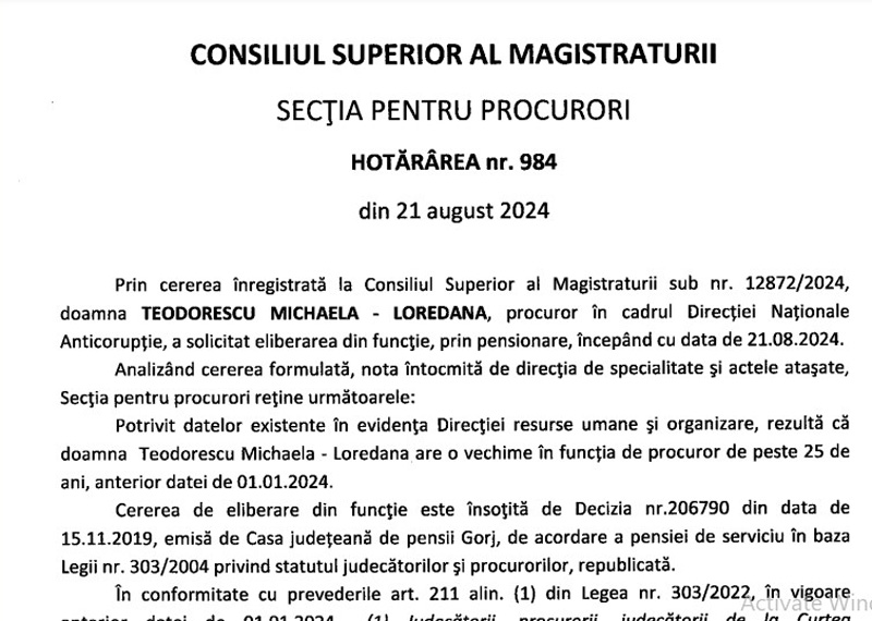 Michaela-Loredana Teodorescu, fosta șefă a Parchetului de pe lângă Tribunalul Gorj, a ieșit la pensie. Președintele Klaus Iohannis a semnat vineri, 6 septembrie, decretul privind „eliberarea din funcția de procuror a doamnei Teodorescu Michaela-Loredana în cadrul Direcției Naționale Anticorupție – pensionare”.