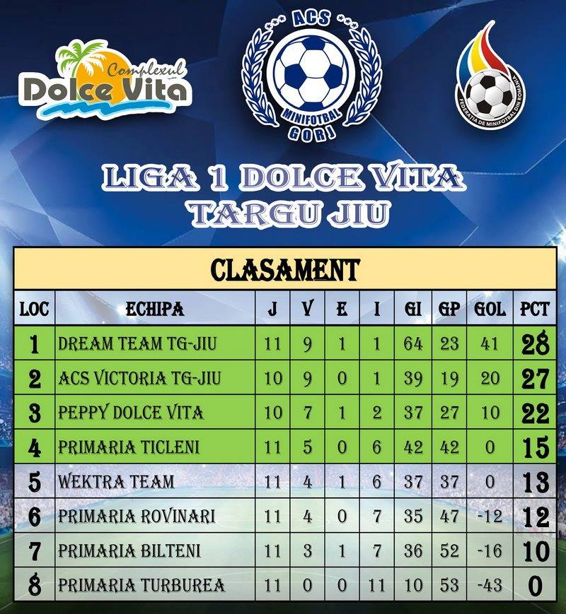În Liga 1 Dolce Vita s-au jucat două meciuri din cadrul etapei cu numărul 11 din sezonul regulat. Campioana Dream Team Târgu Jiu s-a impus, la scor, în meciul cu Primăria Rovinari, în timp ce Primăria Țicleni a făcut un pas important spre clasarea pe locul 4, ultimul calificant în Play-off, grație victoriei la limită cu Primăria Bîlteni.