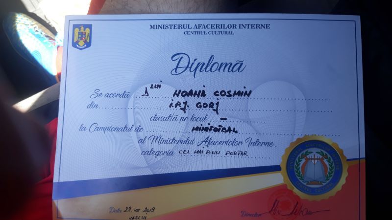 IPJ Gorj mai are un motiv de bucurie. Un agent din cadrul Poliției Motru, Cosmin Noană, a fost desemnat, la Vaslui, cel mai bun portar, în urma rezultatelor obținute în Campionatul de minifotbal al Ministerului Afacerilor Interne.