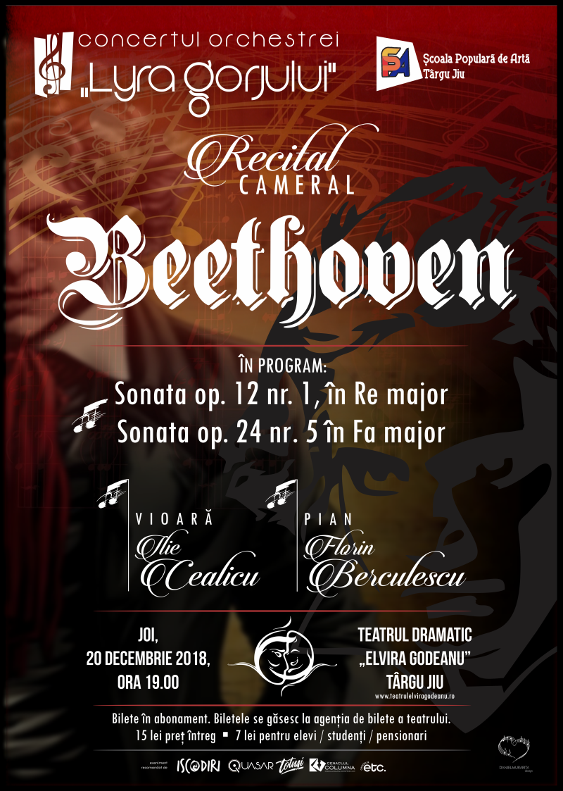 Evenimentul este organizat de Școala Populară de Artă Târgu-Jiu, Consiliul Județean Gorj, în parteneriat cu Teatrul Dramatic “Elvira Godeanu” Târgu-Jiu. Programul aparţine în întregime geniului Ludwig van Beethoven, unul din cei mai mari compozitori din istoria muzicii. Recitalul cuprinde, așadar, două sonate pentru pian și vioară: Sonata op.12 nr.1, în Re major și Sonata op.24 nr.5, în Fa major. Prețul unui bilet este de 15 lei, pentru elevi, studenți și pensionari este de 7 lei. Florin Berculescu, în calitate de pianist, a susţinut peste 300 de concerte şi recitaluri, majoritatea la Târgu-Jiu, dar şi la Râmnicu Vâlcea, Craiova, Bucureşti, abordând un repertoriu vast. A urmat cursuri de specializare în Franţa, la Marsilia, cu Georges Boeuf (compoziţie) şi Anne Marie Girardelli (pian). A contribuit, împreună cu violoncelistul Mircea Suchici la afirmarea Orchestrei de Cameră “Lyra Gorjului” din Târgu-Jiu, dirijând deseori chiar şi componenţa ei simfonică, fiind invitat în calitate de pianist să concerteze în compania acestei orchestre. A susţinut recitaluri de muzică şi poezie în compania unor mari actori români (Ilie Gheorghe, Ovidiu Iuliu Moldovan, Valeria Seciu, Florin Piersic) şi a colaborat în cadrul unui amplu recital cu naistul Gheorghe Zamfir. De asemenea, a desfăşurat o intensă activitate de profesor de pian şi acompaniament la Liceul de Artă “Marin Sorescu” din Craiova şi la Liceul de Artă “Constantin Brăiloiu” din Târgu-Jiu, unde este profesor în prezent. Ilie Cealîcu este iniţiat în tainele viorii la Liceul de Muzică și Arte Plastice din Craiova şi din 1980 până în 1984 îşi desăvârşeşte pregătirea la Conservatorul G. Enescu din Iaşi, unde beneficiază de ajutorul unor maeştri ai învăţământului superior muzical românesc, precum L. Popovici, E. Pîrvu, S. Păutza, S. Varvaroi, E. Bucescu, A. Prelipcean ş.a. Din 1984 devine profesor de vioară în Târgu-Jiu la Şcoala de Muzică, actualul Liceu de Arte C. Brăiloiu, unde activează şi în prezent. Îmbină fericit cele două laturi ale personalităţii sale (cea pedagogică şi cea de violonist) cu rezultate notorii: recitaluri personale, sau de sonate, împreună cu actualul coleg Florin Berculescu, precum şi audiţii ale elevilor săi.