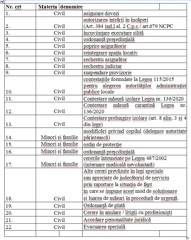Lista cu obiectele urgente, în materie civilă, care vor fi judecate în cursul vacanței judecătorești din perioada 18.07.2022-26.08.2022: