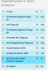 CS Pandurii Lignitul Târgu-Jiu ocupă locul 1, cu 43 de puncte, în clasamentul Juniori E, sezonul 2018/2019, aflându-se la patru puncte de singura sa urmăritoare, LPS Târgu-Jiu.