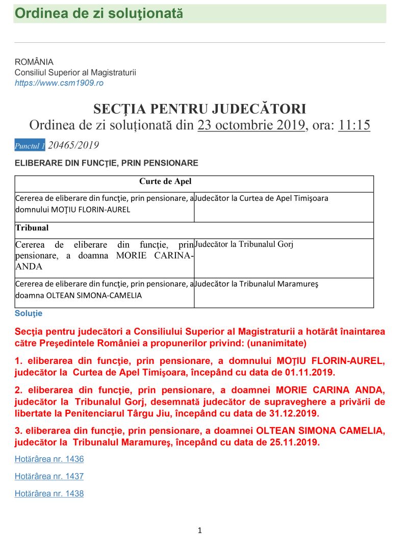 La întrunirea Consiliului Superior al Magistraturii, care a avut loc la jumătatea săptămânii trecute, pe ordinea de zi s-a aflat și cererea de eliberare din funcție, ca urmare a pensionării, a judecătorului Morie Carina Anda, magistrat la Tribunalul Gorj. Secția pentru judecători a CSM a hotărât astfel, cu unanimitate, înaintarea către Președintele României a acestei propuneri. Judecătoarea Morie este unul dintre mulții magistrați gorjeni, cu experiență, care au preferat pensionarea în ultimul timp, deși i s-ar mai fi permis rămânerea în sistem pentru o perioadă determinată.