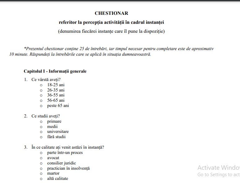Chestionarul, disponibil în format fizic și online, este adresat participanților la proceduri judiciare în fața instanțelor de judecată, respectiv justițiabili, avocați, consilieri juridici, practicieni în insolvență și orice altă categorie de persoane implicate în proceduri judiciare derulate în fața instanțelor judecătorești.