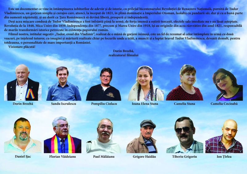 Mi-ar face mare plăcere să cred că, atât la nivel local, în Gorj, dar și prin alte părți ale țării, manifestările prilejuite de comemorarea împlinirii a două sute de ani de la acea revoltă a oamenilor simpli să aibă un rol important în conștientizarea generațiilor actuale de români despre ideea că cinstirea marilor înaintași, cum este și Tudor Vladimirescu, înseamnă, în primul rând, respect pentru dumnealor, iar mai apoi respect pentru țară și pentru viitorul urmașilor de mâine și de poimâine. «Poporul care nu-și cunoaște istoria este la fel ca un copil ce nu-și cunoaște părinții… » spunea odinioară celebrul Nicolae Iorga. Să nu-l dezamăgim pe marele cărturar, iar gorjenii să fie primii la tot ceea ce a însemnat și înseamnă Tudor Vladimirescu pentru istorie și pentru neam!”, este mesajul transmis de către domnul Dorin Brozbă – realizatorul filmului. Referitor la film, domnul Brozbă ne-a mărturisit că: „Este un documentar ce vine întâmpinarea iubitorilor de adevăr și de istorie, cu prilejul bicentenarului Revoluției de Renaștere Națională pornită de Tudor Vladimirescu, un gorjean simplu și curajos, care, atunci, la început de an 1821, în plină dominație a Imperiului Otoman, laolaltă cu pandurii săi, dar și cu o bună parte din oamenii năpăstuiți, și-au dorit ca Țara Românească să devină liberă, prosperă și independentă. Deși acea mișcare condusă de Tudor Vladimirescu a fost înfrântă până la urmă de forța imensă a oștirii turcești, efectele sale imediate nu s-au lăsat așteptate. Revoluția de la 1848, Mica Unire din 1859, Independența din 1877, precum și Marea Unire din 1918 își au originile din acea răzvrătire a anului 1821, responsabilă de marile transformări istorice petrecute în existența poporului român. Filmul nostru, intitulat sugestiv «Tudor, eroul din Vladimir», realizat de o mână de gorjeni inimoși, este un fel de rezumat al celor întâmplate în urmă cu două veacuri, pe înțelesul tuturor, cu imagini și mărturii realizate chiar pe locurile unde a trăit, a muncit și a luptat bravul Tudor Vladimirescu, devenit de mult, pentru totdeauna, o personalitate de mare importanță a României.”