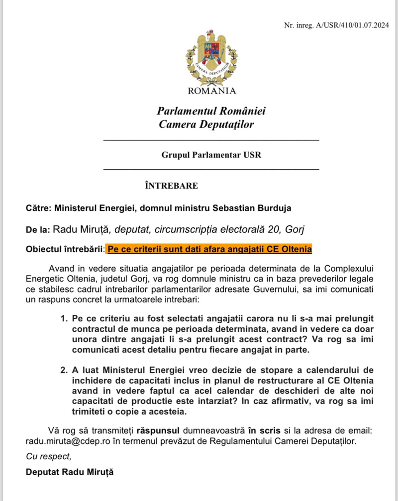 Deputatul de Gorj, președinte al USR Gorj, Radu Miruță, l-a întrebat pe ministrul Energiei, Sebastian Burduja care sunt criteriile care au stat la baza celor 124 de disponibilizări:
