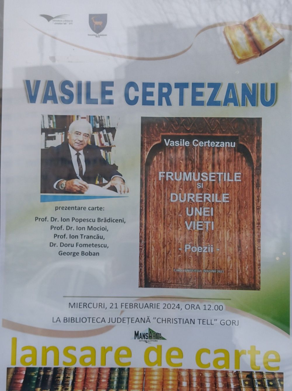 Biblioteca Județeană “Christian Tell” din reședința județului Gorj va fi miercuri, 21 februarie a.c., de la ora 12.00, gazda unui eveniment literar deosebit. Este vorba despre lansarea de carte “Frumusețile și durerile unei vieți”, autor Vasile CERTEZANU, iar în deschiderea evenimentului vor vorbi prof. univ. dr. Ion Popescu Brădiceni, prof. univ. dr. Ion Mocioi, profesorul Ion Trancău, medicul și scriitorul Doru Fometescu, precum și fotoreporterul George Boban.