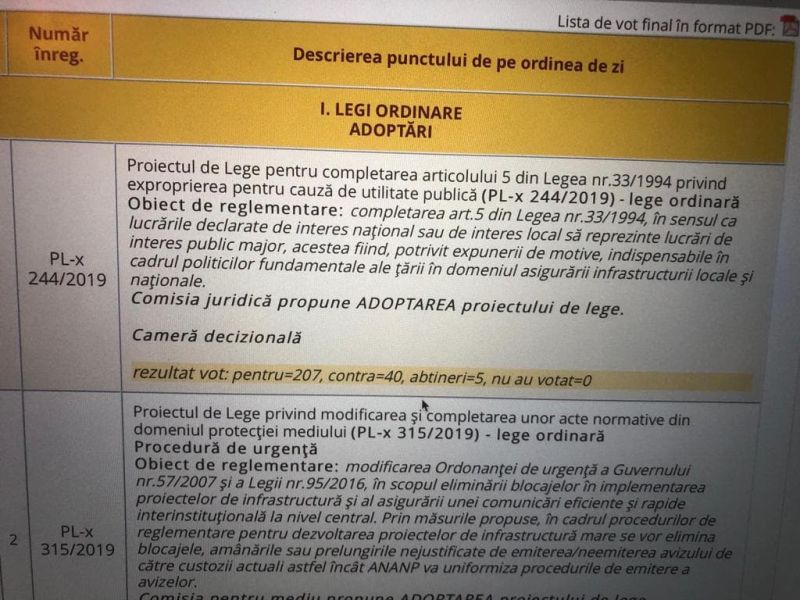 Parlamentarul social-democrat Elvira Șarapatin a adus modificări legii nr.33/1994 privind exproprierea pentru cauză de utilitate publică prin care se vor debloca obiectivele de investiții pentru dezvoltarea infrastructurii locale și naționale.Inițiativa legislativă a fost votată, miercuri, de Camera Deputaților, în calitate de for decizional cu 207 voturi pentru, 40 contra și 5 abțineri.