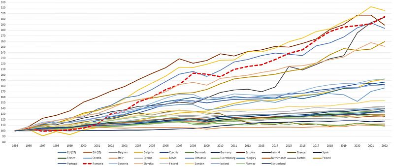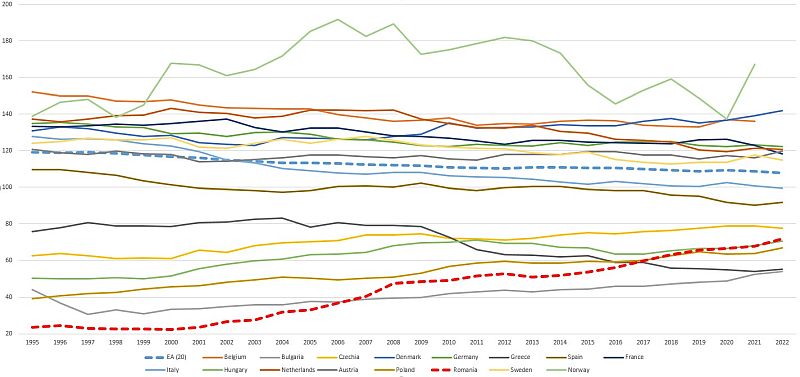 Figura 1. Productivitatea orară în termeni nominali exprimată ca procent din media UE-27 (la paritatea puterii de cumpărare, perioada 1995 – 2022)