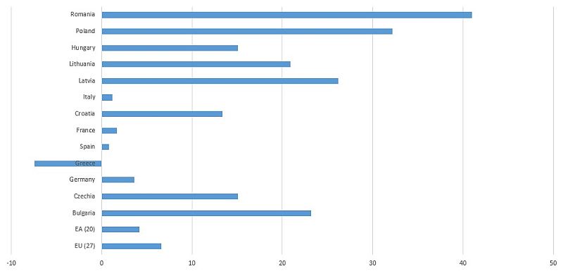 Dinamica favorabilă a productivității muncii în România este evidențiată și de Figura 2 de mai jos, în care se observă că pe ansamblul celor 27 de ani pentru care Eurostat publică aceste informații, creșterea productivității medii orare în termeni reali în România a fost a doua cea mai rapidă din UE după cea a Letoniei, semnificativ mai mare decât a Poloniei și la distanță considerabilă de cele consemnate de Cehia, Ungaria sau Bulgaria.