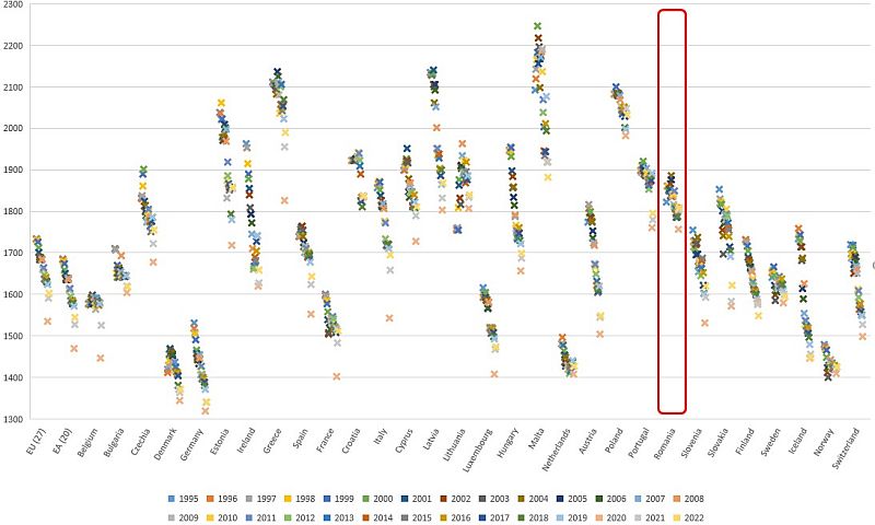 În acest context, este interesant de observat că numărul mediu de ore lucrate în decurs de un an de către un salariat (1808,2 ore în anul 2022) nu a fluctuat foarte mult pe parcursul ultimilor 27 de ani și s-a menținut undeva la mijloc în plaja de valori consemnate pentru celelalte state din UE, având de exemplu ca reper nivelurile înregistrate anul trecut în cazul Poloniei (2032,9 ore) sau al Greciei (1989,9 ore), pe de o parte și, respectiv, al Cehiei (1754,1 ore), Ungariei (1699,5 ore) sau Bulgariei (1618,7 ore), pe de altă parte.