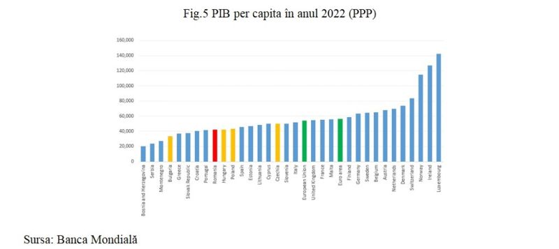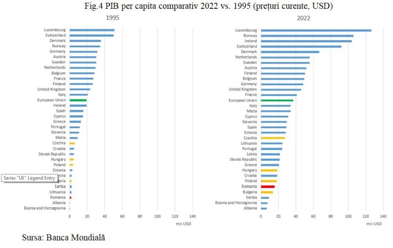 Tendințele în evoluția PIB per capita descrise mai sus pentru România sunt corelate cu cele ale țărilor din regiune, dar și la nivelul de ansamblu al Uniunii Europene. Figura 4 compară nivelul PIB per capita doar între anii de început și de sfârșit ai perioadei analizate, respectiv 1995 versus 2022, dar pentru o selecție mult mai largă de state din spațiul geografic european. Pentru că a pornit cu un decalaj foarte mare, deși a crescut foarte rapid, în ultimii 27 de ani România a câștigat doar două poziții în clasamentul regional, surclasând Bulgaria și Serbia, dar rămânând în continuare în urma Poloniei, Ungariei și, mai ales, a Cehiei. Totuși diferențele (în termeni procentuali) sunt mult mai mici în 2022 comparativ cu nivelurile din 1995. Față de Cehia (cea mai avansată din regiune), acum avem de recuperat un decalaj de 74 la sută ceea ce este o îmbunătățire față de nivelul de 253 la sută din 1995. Iar Polonia și Ungaria ne depășesc cu 15 și respectiv 16 procente, față de 123 la sută și, respectiv, 172 la sută în 1995.