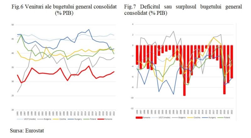 Observațiile formulate mai sus nu sunt însă specifice României. Însă, așa cum arată Figura 6 de mai jos, unul dintre elementele prin care România s-a singularizat în cadrul regiunii pe parcursul ultimilor 27 de ani a fost nivelul în permanență mai redus al veniturilor bugetului general consolidat (ca pondere în PIB) față de celelalte țări. Nu un an, nu cinci, nu zece, ci douăzeci și șapte de ani la rând, ponderea în PIB a veniturilor bugetului general consolidat a fost în cazul României semnificativ mai mică decât în Polonia, Ungaria și Cehia. Inclusiv în Bulgaria ponderea a fost în majoritatea acestei perioade mai ridicată față de România, cu excepția anilor 1995-1996 și 2011.