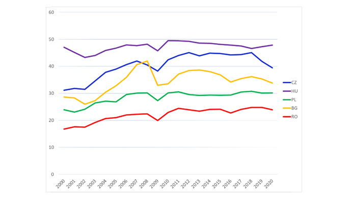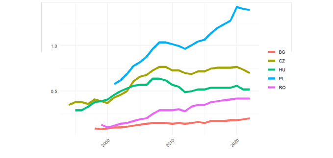 Datele publicate de Eurostat arată că pe parcursul ultimilor 20 de ani cota de piață a exporturilor românești în cadrul comerțului internațional cu bunuri și servicii a crescut semnificativ, dar s-a menținut la unul dintre cele mai reduse niveluri prin comparație cu țările din zonă. Graficul de mai jos arată că Polonia a consemnat cel mai important câștig de cotă de piață în perioada menționată, evoluția sa ascendentă fiind stopată doar în anii de maximă intensitate ai crizei financiare globale și ai crizei datoriilor suverane în Europa, iar ulterior în perioada pandemică. România a înregistrat la rândul său un avans important în termeni relativi, plecând de la o bază mult mai redusă, însă nu a câștigat pe parcursul a mai mult de 20 de ani nici o poziție în clasamentul regional, chiar dacă Ungaria și Cehia au avut practic o evoluție plafonată ulterior anului 2007. Astfel, cota de piață a exporturilor românești s-a distanțat semnificativ de cea a Bulgariei, care a consemnat un progres mult mai lent și s-a apropiat de cea a Ungariei, fără însă să o depășească deocamdată.