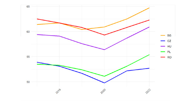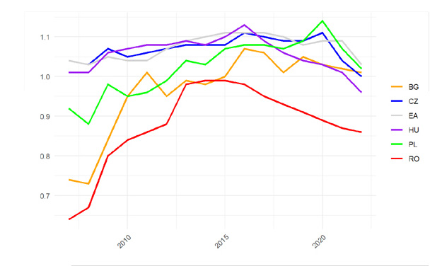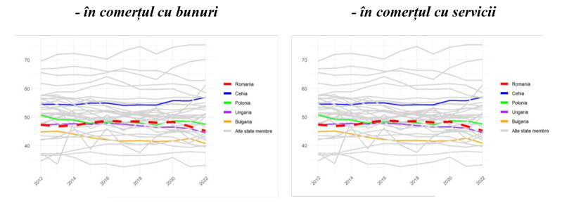 Un factor important pentru evoluția nefavorabilă l-a reprezentat deficitul bugetar semnificativ mai mare consemnat în România față de țările vecine, dar și factorii structurali au continuat să aibă un rol. Această din urmă afirmație este susținută de imaginea de ansamblu oferită de Figura 4 de mai jos, care arată că România a consemnat, pe parcursul întregii perioade 2015-2022, una dintre cele mai mari ponderi a valorii tranzacțiilor cu produse intermediare raportate la cea a comerțului internațional cu bunuri (importuri + exporturi), fiind depășită doar de Bulgaria.