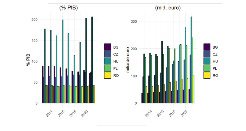 În cazul României, deși fluxurile nete de investițiile străine directe au crescut semnificativ în ultimii ani, iar stocul lor a depășit în anul 2021 pragul de 100 de miliarde de euro, această valoare ne plasează încă la o mare distanță în urma Ungariei, Poloniei, dar și a Cehiei. În termeni relativi, raportat la PIB, stocul de ISD este comparabil cu cel al Poloniei, dar semnificativ mai mic decât în cazul Bulgariei și al Cehiei și cu mult în urma Ungariei. Totodată, se observă că în cazul României și al Poloniei, raportul dintre ISD și PIB s-a menținut stabil pe ansamblul perioadei 2013-2021, în jurul nivelului de 41 la sută, în Cehia acesta a crescut de la circa 61 la sută până la aproximativ 74 la sută, iar în Bulgaria s-a diminuat ușor, de la 87 la sută la 71 la sută. Potrivit Eurostat, în Ungaria, raportul dintre stocul de investiții străine directe și PIB era în anul 2021 de peste 205 la sută.