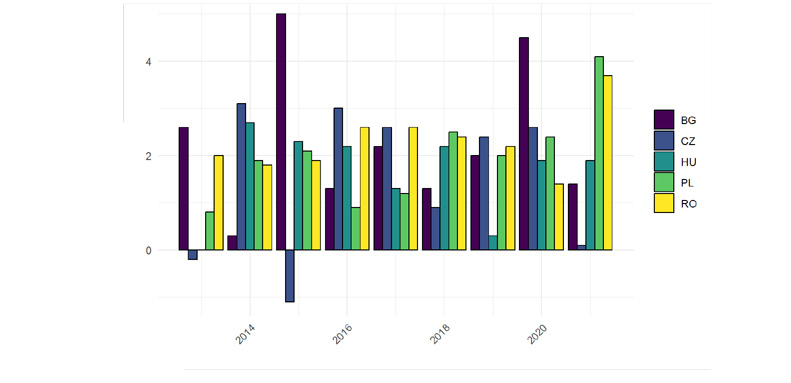 Dacă încercăm să explicăm aceste diferențe prin perspectiva fluxurilor anuale, observăm că și în acest caz suntem în prezența unui decalaj ce vine în bună parte din urmă, din perioada anterioară crizei financiare globale și a integrării României în Uniunea Europeană. Figura 7 de mai jos arată că în perioada 2013 – 2021 fluxurile de ISD raportate la PIB au manifestat o volatilitate destul de ridicată în cazul tuturor țărilor menționate, fără să se evidențieze în mod clar un lider regional cu performanță net superioară în atragerea ISD, raportat la dimensiunea economiei proprii.