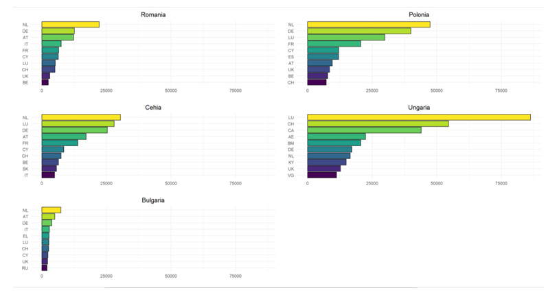 Observăm că structura este relativ asemănătoare în cazul Poloniei, României, Cehiei și al Bulgariei, de fiecare dată printre primele patru țări din clasament regăsindu-se Olanda și Germania, în multe cazuri Austria și Franța sau Italia. Luxemburg apare, de asemenea, între primele patru țări de origine în cazul Cehiei și al Poloniei, dar nu pe prima poziție. În cazul Ungariei însă, țara cu cel mai mare stoc de ISD din regiune (atât ca valoare, cât și ca pondere în PIB), se poate observa o imagine aparte: Luxemburg se plasează pe primul loc la o distanță semnificativă față de al doilea clasat care este Elveția, urmate de Canada și de Emiratele Arabe Unite. Pe locuri importante în clasamentul primelor 10 țări de origine ale investitorilor străini în Ungaria se regăsesc și jurisdicții preferate de fonduri de investiții precum Bermuda, Insulele Caiman, Insulele Virgine.