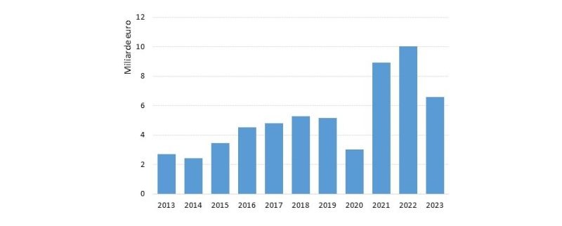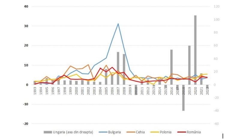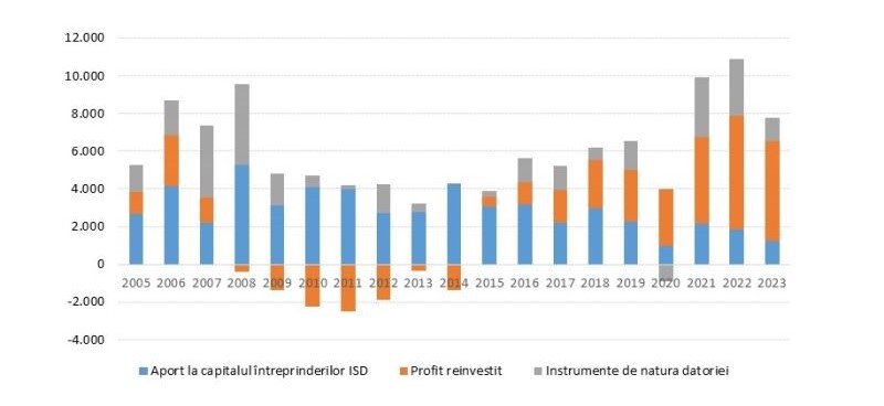 Coroborând cele două figuri de mai sus, putem afirma că, deși raportat la PIB, România atrage anual ISD la un nivel mai redus comparativ cu Cehia sau Polonia, dinamica acestora este una favorabilă pe ansamblu, în special având în vedere climatul economic şi geopolitic volatil de pe parcursul ultimilor 4 ani. Astfel, reducerea de amploare a valorii ISD din primul an pandemic (deși considerabil mai puțin amplu comparativ cu scăderile înregistrate în criza din 2008-2009), a fost urmată de creșteri puternice în 2021 și 2022. De aceea, cuantumul din 2023 (mai redus față de 2022 și 2021) poate fi interpretat ca o normalizare a situației și o reașezare pe un trend care rămâne ascendent pe termen mediu, dar într-un un ritm mai apropiat de condițiile actuale din economia locală, în contextul vulnerabilităților ce afectează percepția investitorilor străini față de noi (deficitele gemene), în etapa curentă de dezvoltare pe care o parcurgem, dar și în contextul tensiunilor geopolitice locale și globale, care se dovedesc a fi mult mai persistente decât ne-am așteptat.