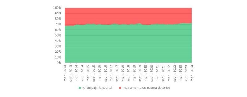 Un element pozitiv ce poate fi observat in figura de mai sus este faptul că, pe ansamblul întregului interval analizat, cele două elemente ale participațiilor la capitalurile proprii menționate anterior rămân dominante în raport cu cuantumul instrumentelor de natura datoriei. Astfel, în luna martie 2024 (conform celor mai recente date disponibile privind soldul ISD conform principiului direcțional), participațiile la capitalurile proprii au consemnat cea mai ridicată pondere din totalul soldului ISD în România din ultimii 10 ani, de aproximativ 72,7 %.