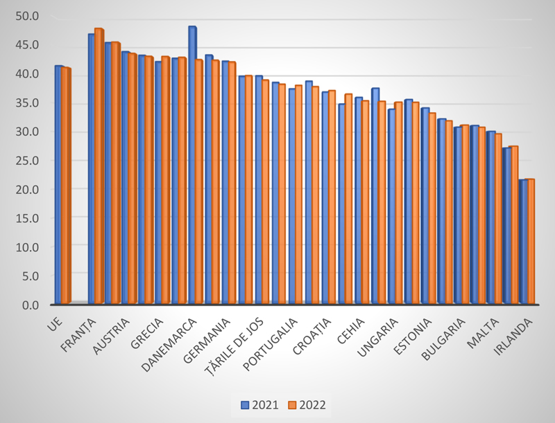 Figura 3: Ponderea în PIB a veniturilor bugetare din impozite și contribuții sociale, în perioada 2021-2022, pentru statele membre UE